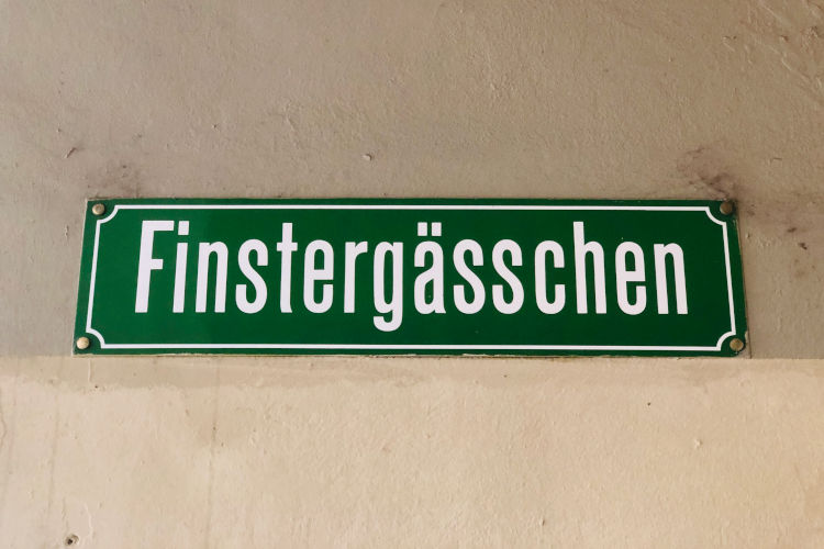 Finstergässchen: Grünes Strassenschild im Berner Altstadtbezirk 3.